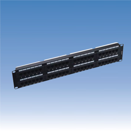 48口超五类配线架 按照国际标准设计生产的用于19英寸机柜的组合RJ45插座; IDC:磷青铜材质,镀银,可接线径0.4-0.6mm,卡接(打线)重复次数>200次; 8线簧针:磷青铜材质,接触部位镀金≥3μinch 、6μinch 、15μinch 、30μinch 、50 μinch; 插头插座插拔次数≥750; 注塑件材料: PC.PBT(阻燃级) 金属构件:冷轧板,喷塑; 技术性能符合: TIA/EIA-568-B.1
