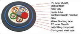 Structure: Metallic strength member, loose tube stranded and filled with jelly, corrugated steel tape with PE outer sheath. Applications: Local area network system, long distance communication system, subscriber network system Installation method: Direct burial, conduit, cable trench, aerial Operating temperature: -40℃~+70℃ Cable specifications: